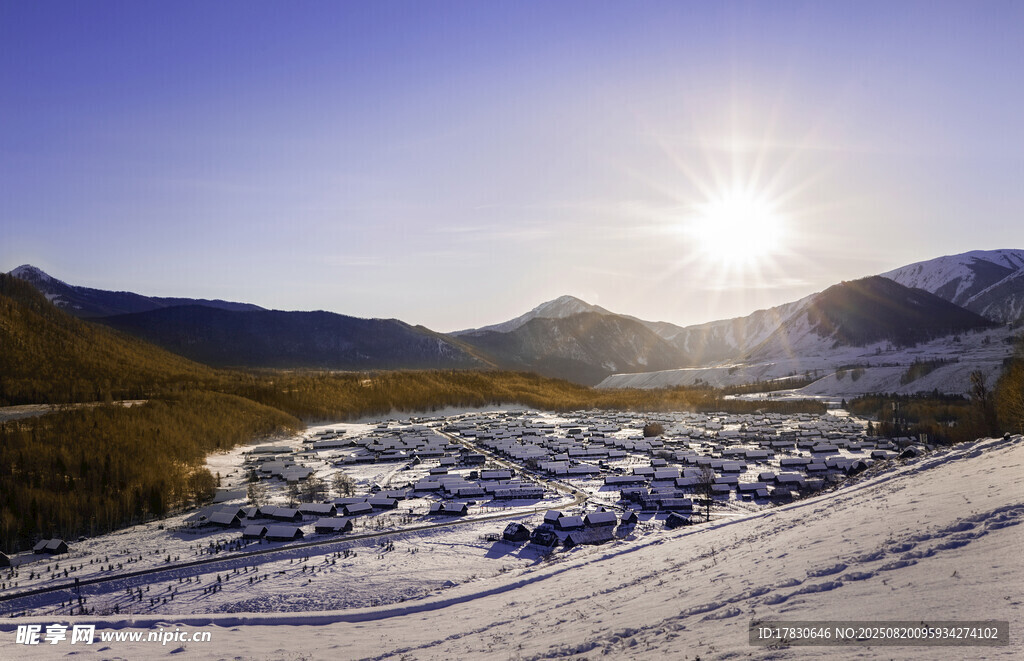 冬日雪中小鎮(zhèn)的明媚陽光圖片