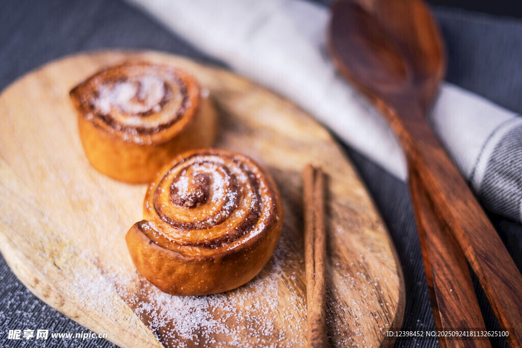 木制砧板上的美味肉桂卷圖片