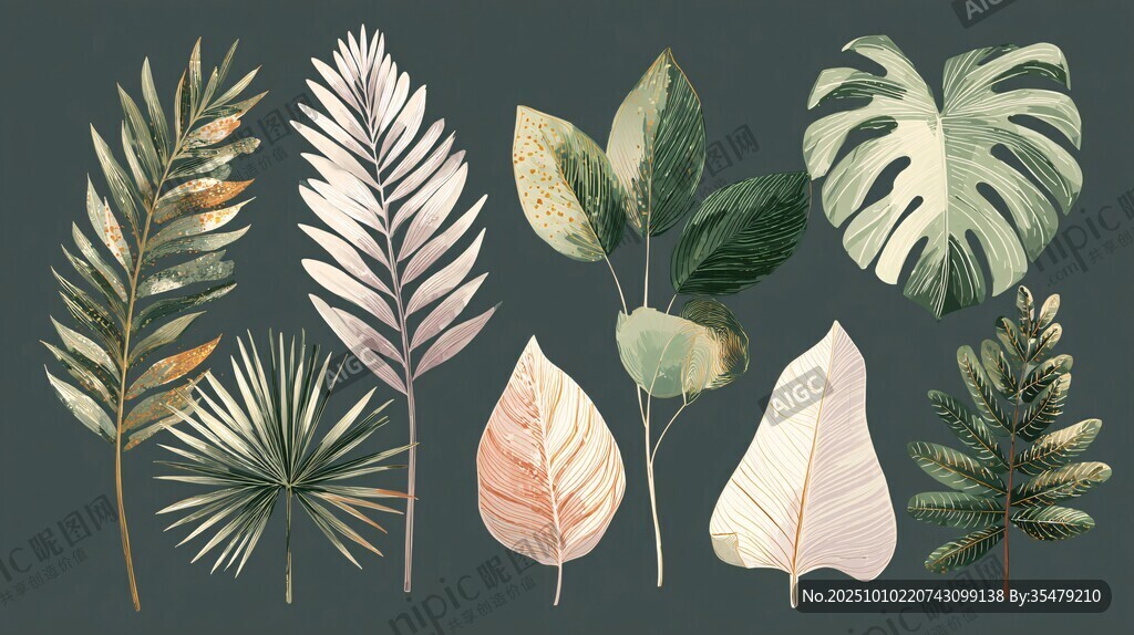 多樣熱帶植物葉片插畫圖片